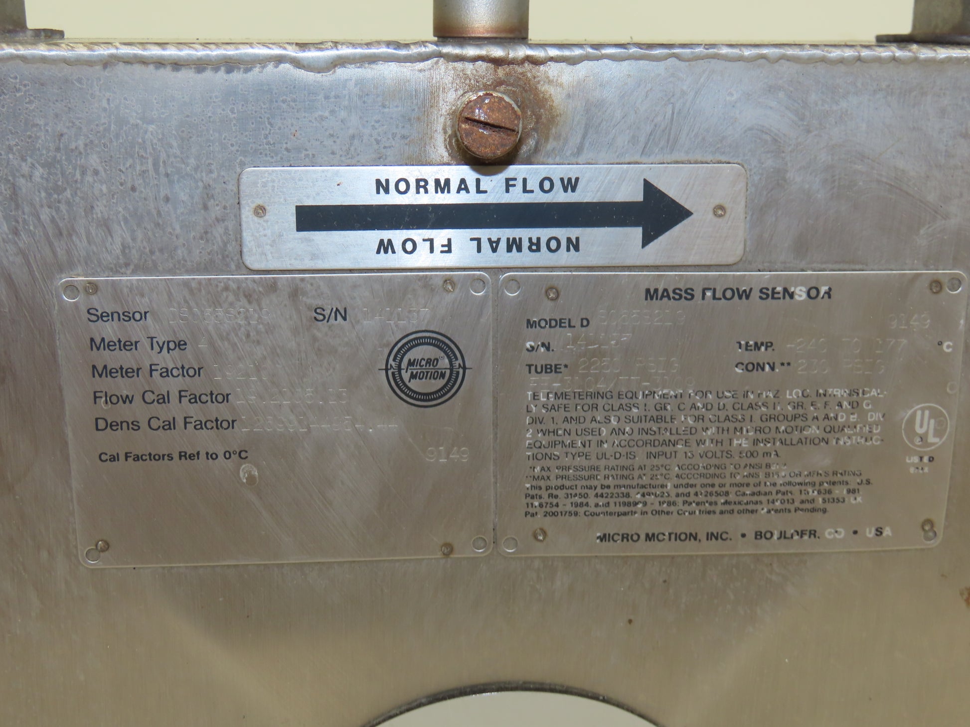 Micro Motion D S065S219 Mass Flow Sensor 1" ANSI Flange 2250psi -240 to 177° C
