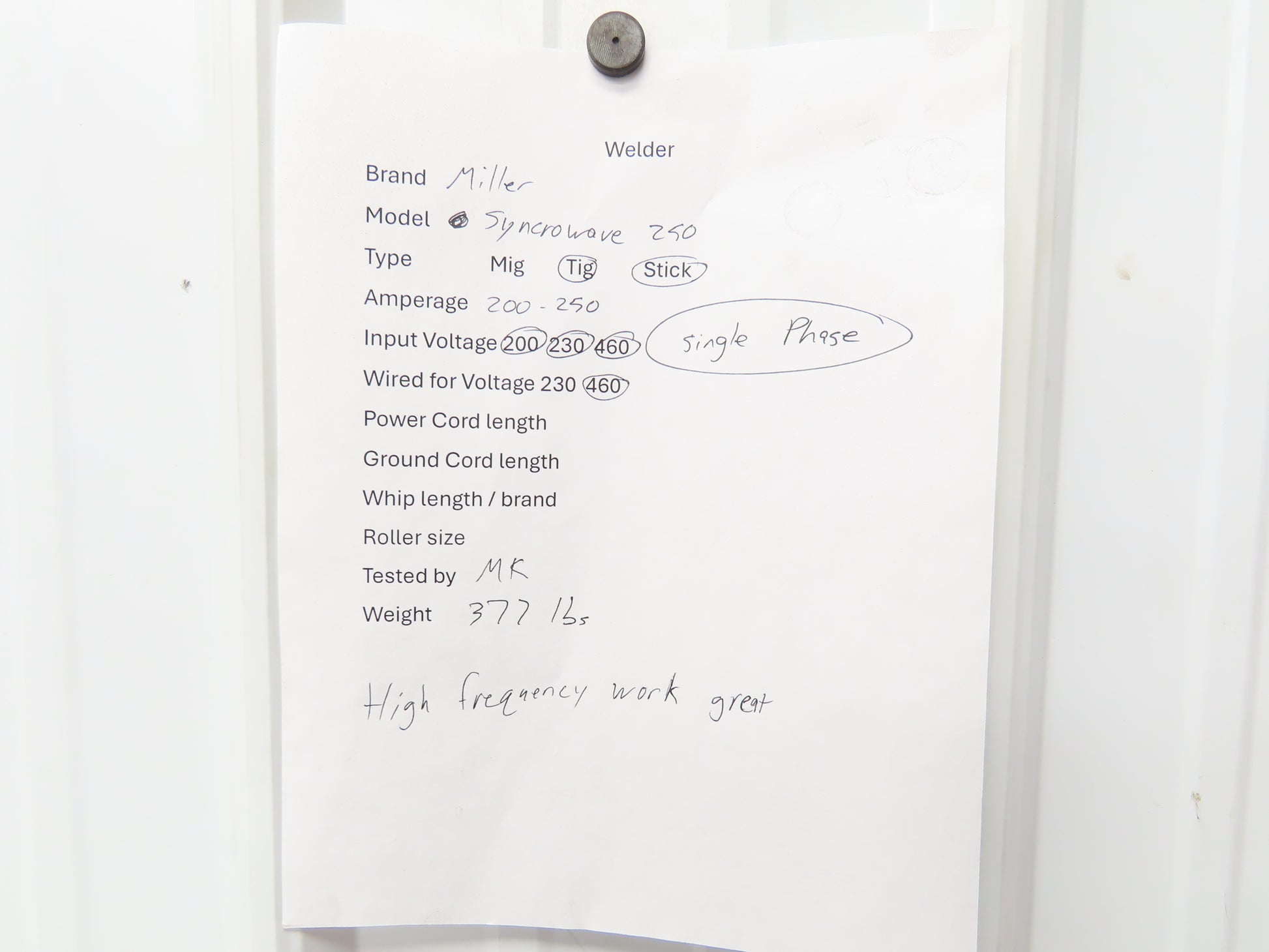 - Wired for 460V currently but can be changed.