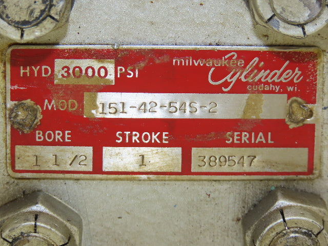 Milwaukee 151-42-54S-2 Hydraulic Cylinder 1-1/2" Bore 1" Stroke 3000psi Lug Mt