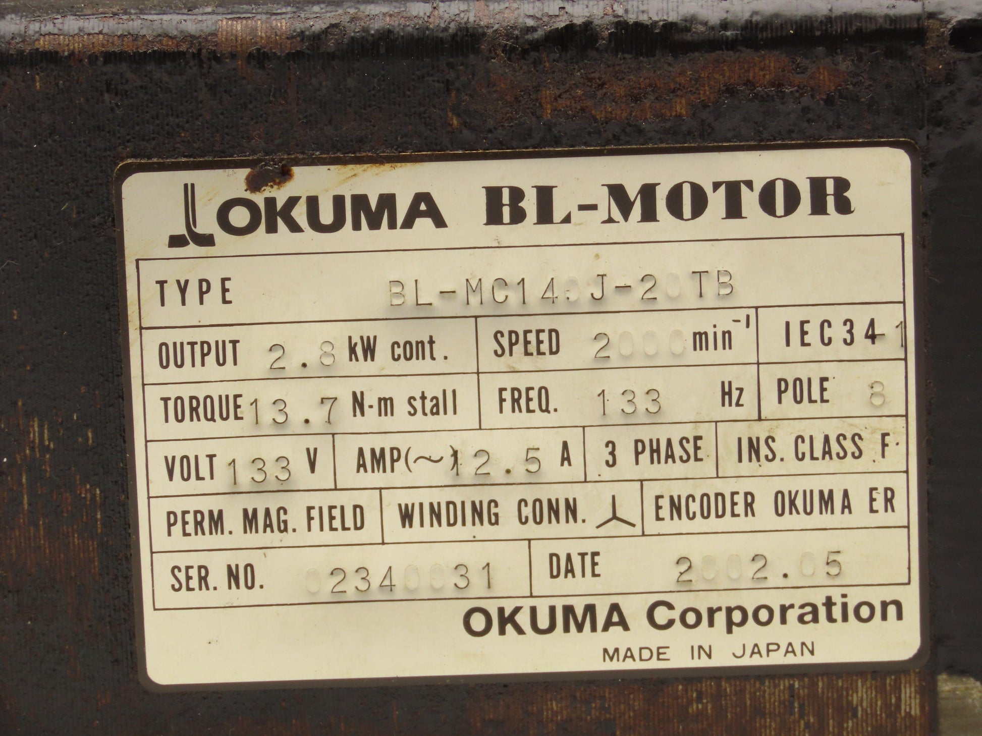 Okuma BL-MC140J-20TB AC Servo Motor 2.8kW 133V 2000 RPM 3PH Encoder ER-J-7200D