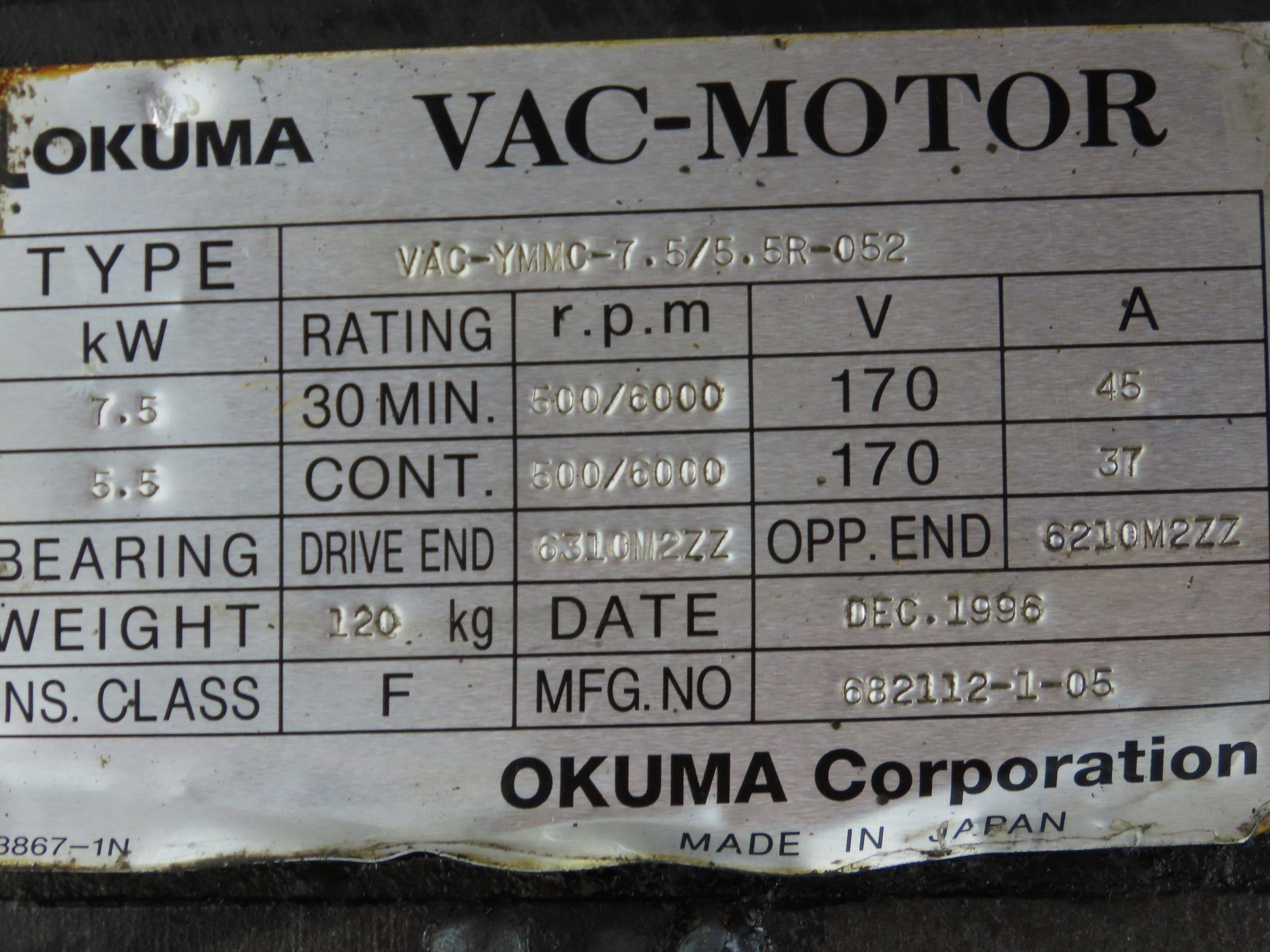 Okuma VAC-YMMC-7.5/5.5R-052 CNC Lathe AC Servo Spindle Motor 10Hp