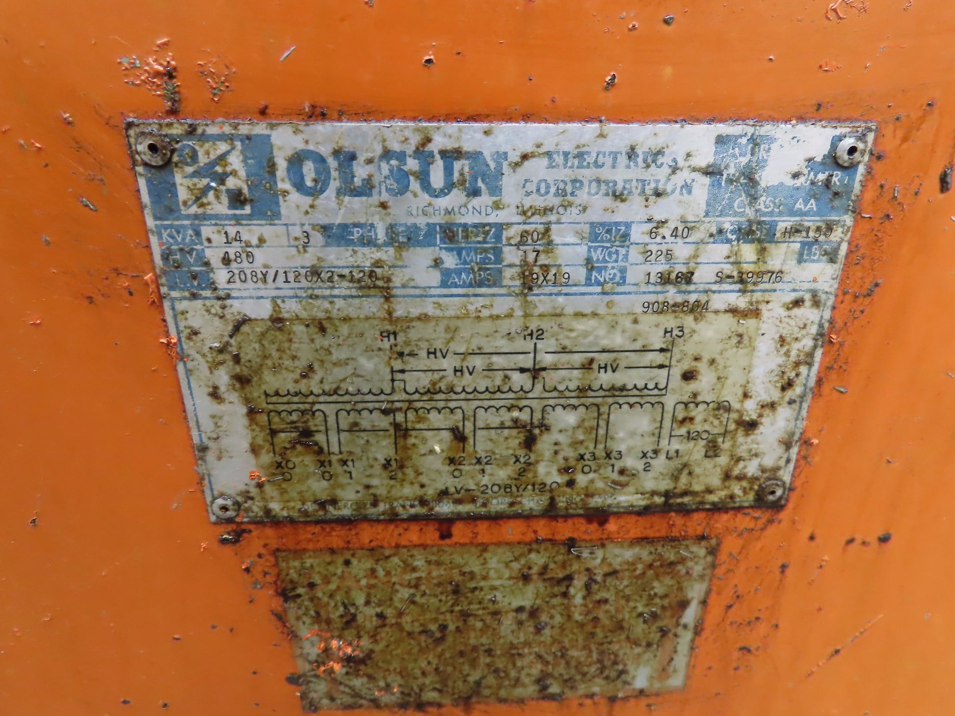 Olson 13167 Step Down Power Transformer 14kva 3Ph HV 480V Delta LV 208Y/120V