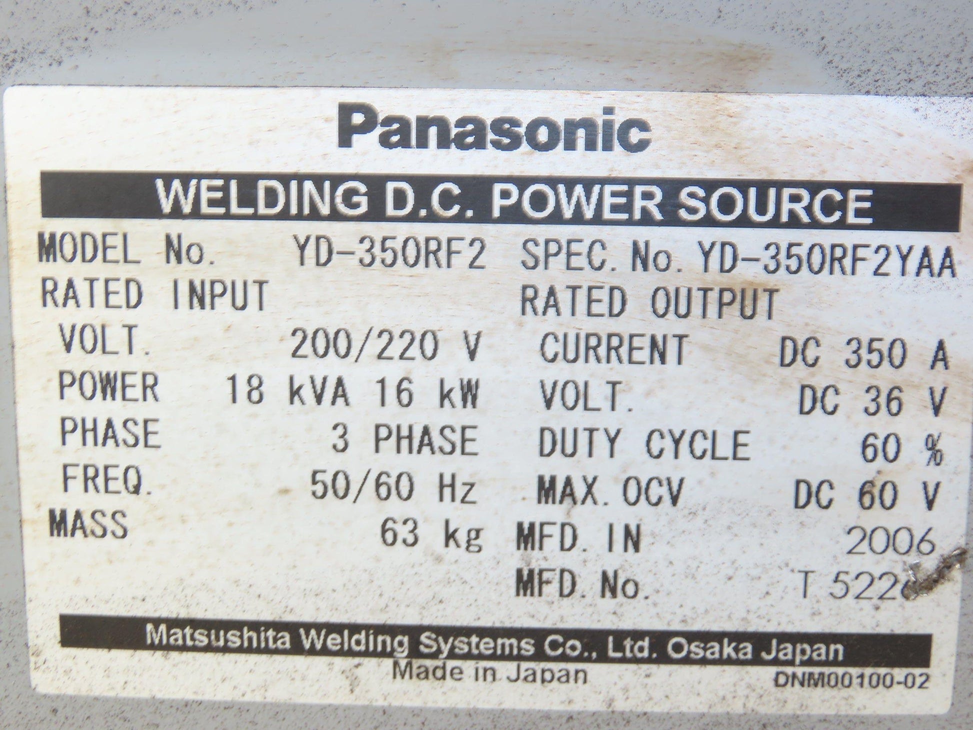 Panasonic YD-350RF2 Pana Star 350A Robot Welding 36V DC Power Source 200V 18kva