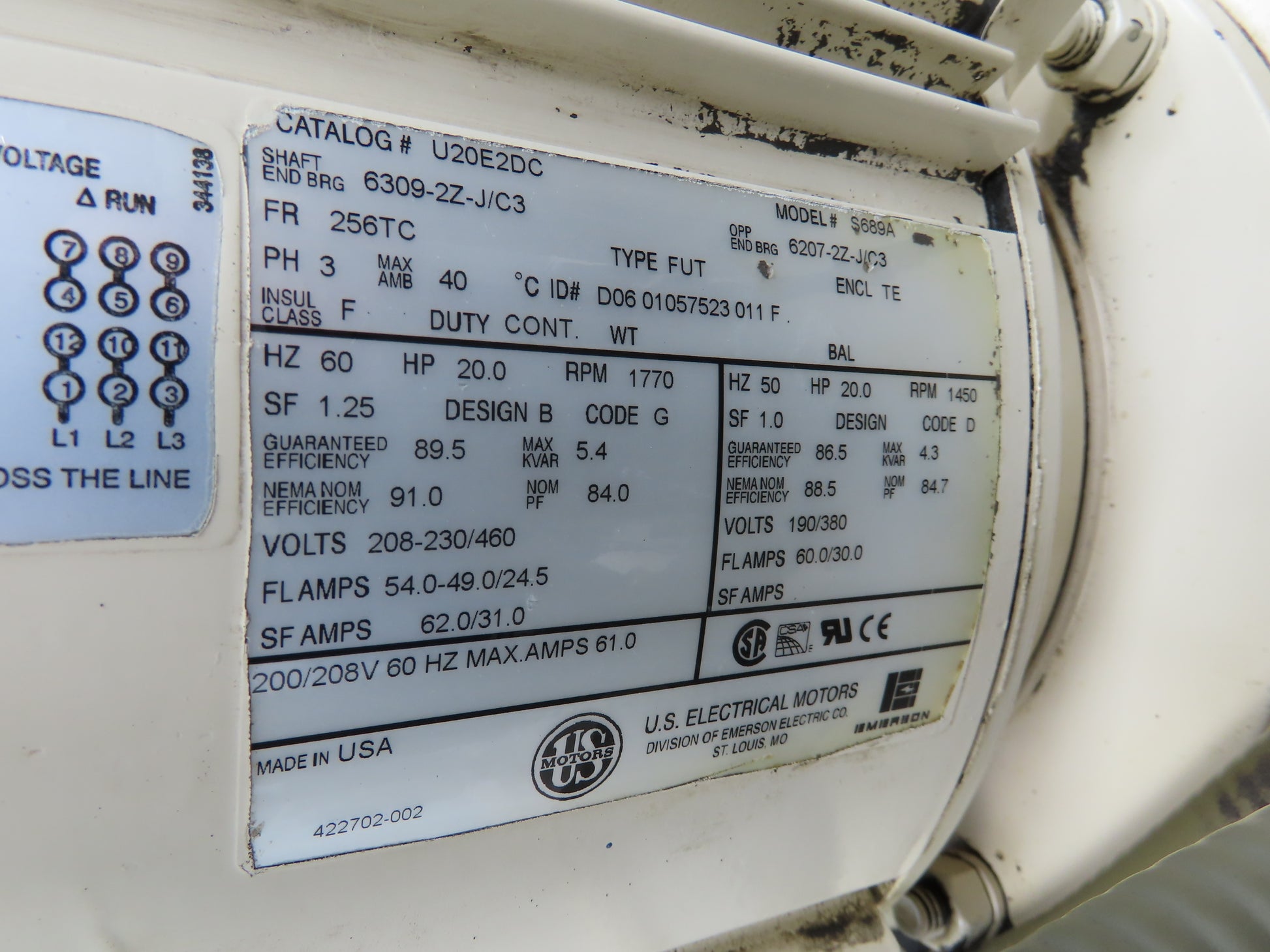 - Motor Brand & Model Number: U.S. Electrical Motors U20E2DC