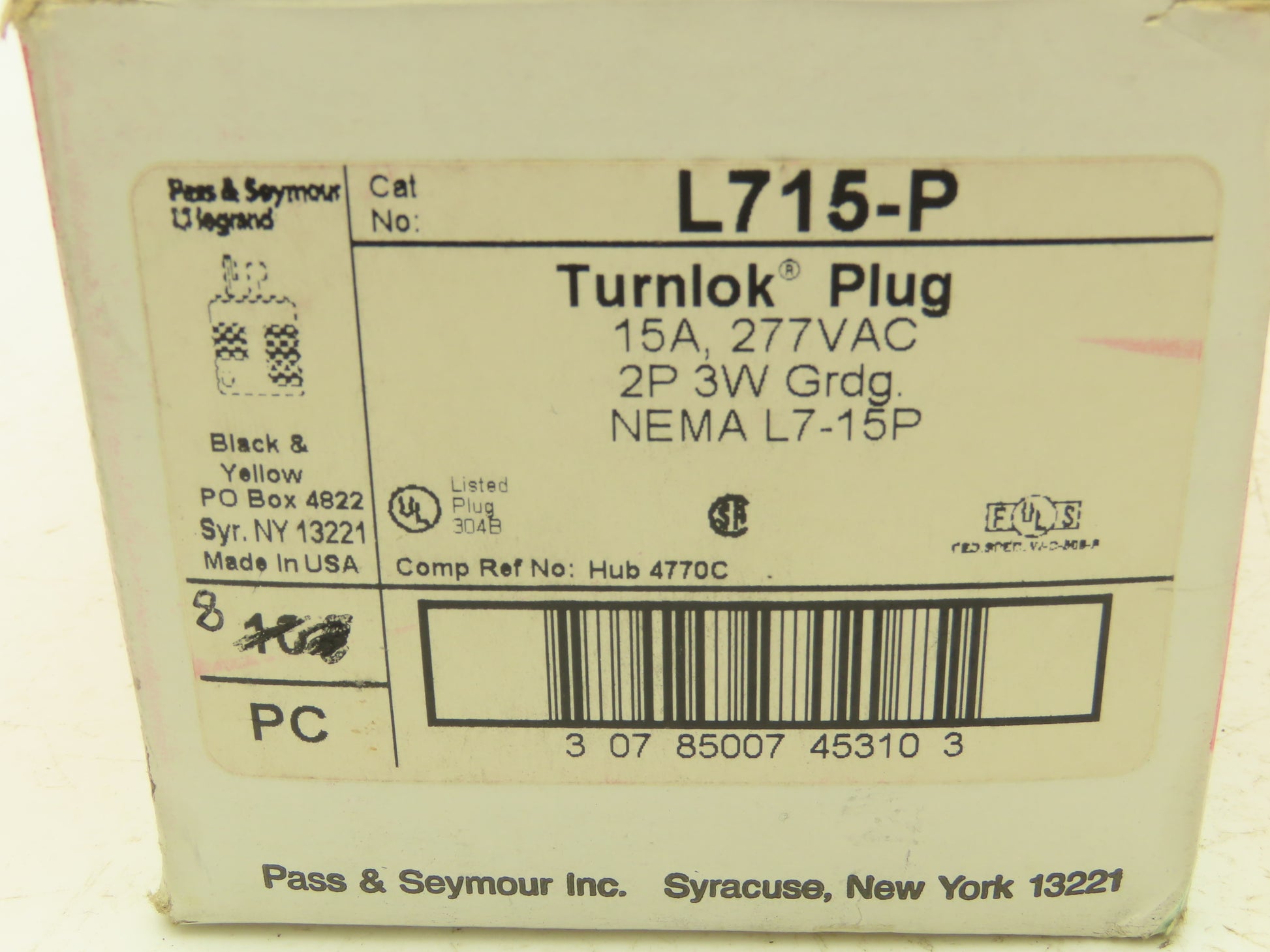 Pass & Seymour L715-P Legrand Turnlok Plug 2P 3W Grounding 15A 277VAC Box of 8