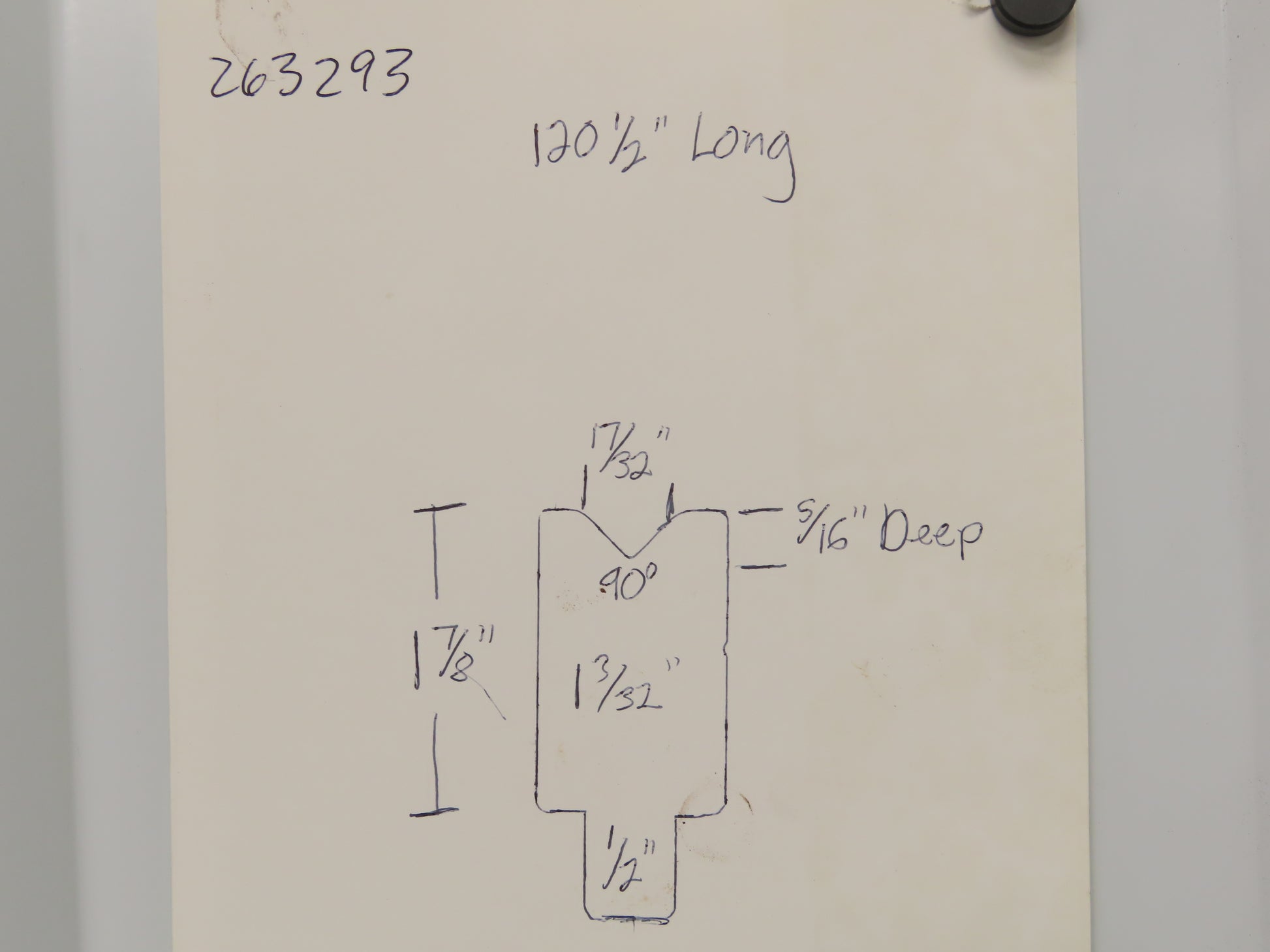 - The V is 90°. 17/32" wide and 5/16" deep.