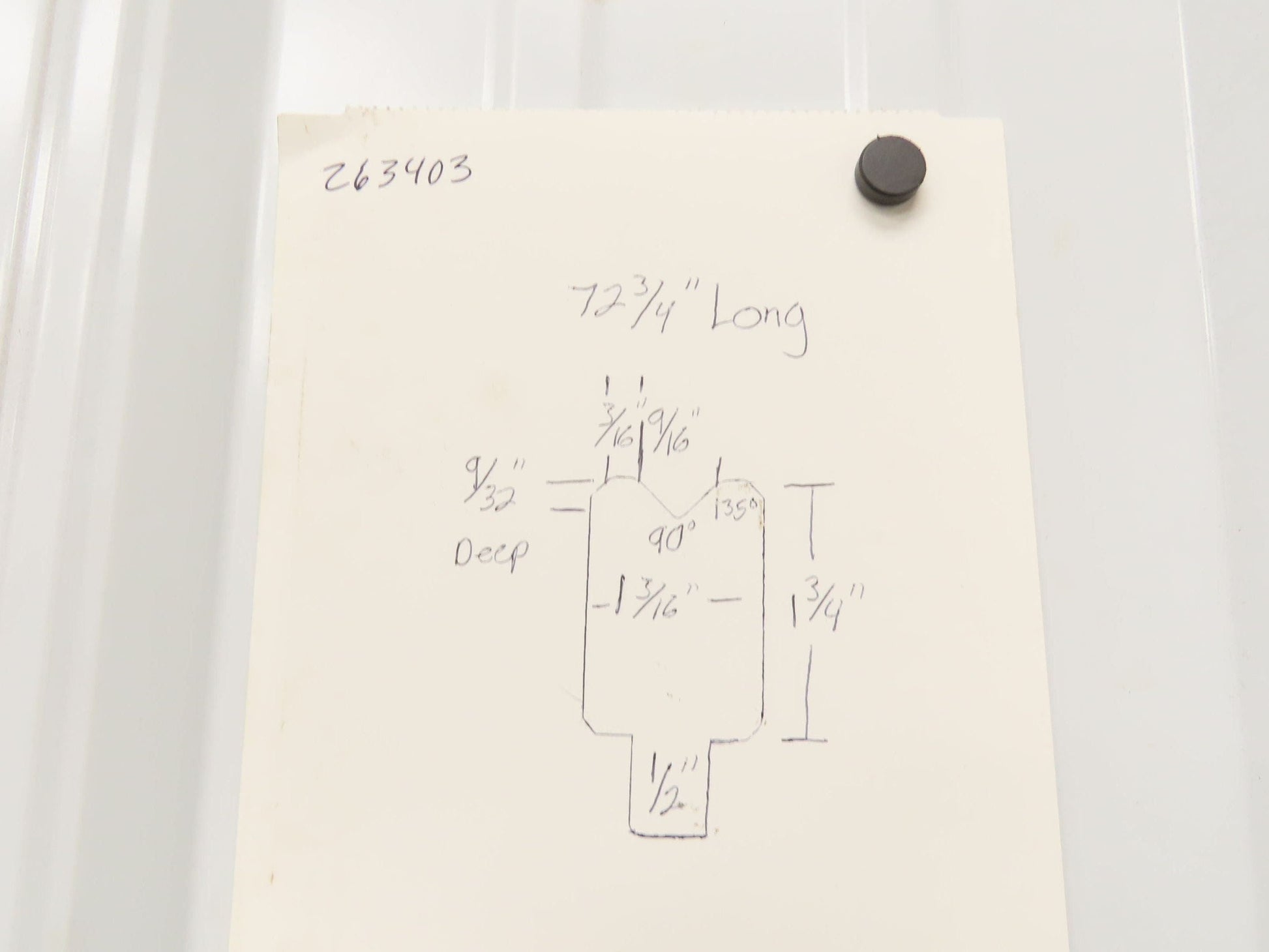 Press Brake Die 72-3/4" Long 90° V 9/16" W 9/32" D 1-3/4" H 1/2" Tang