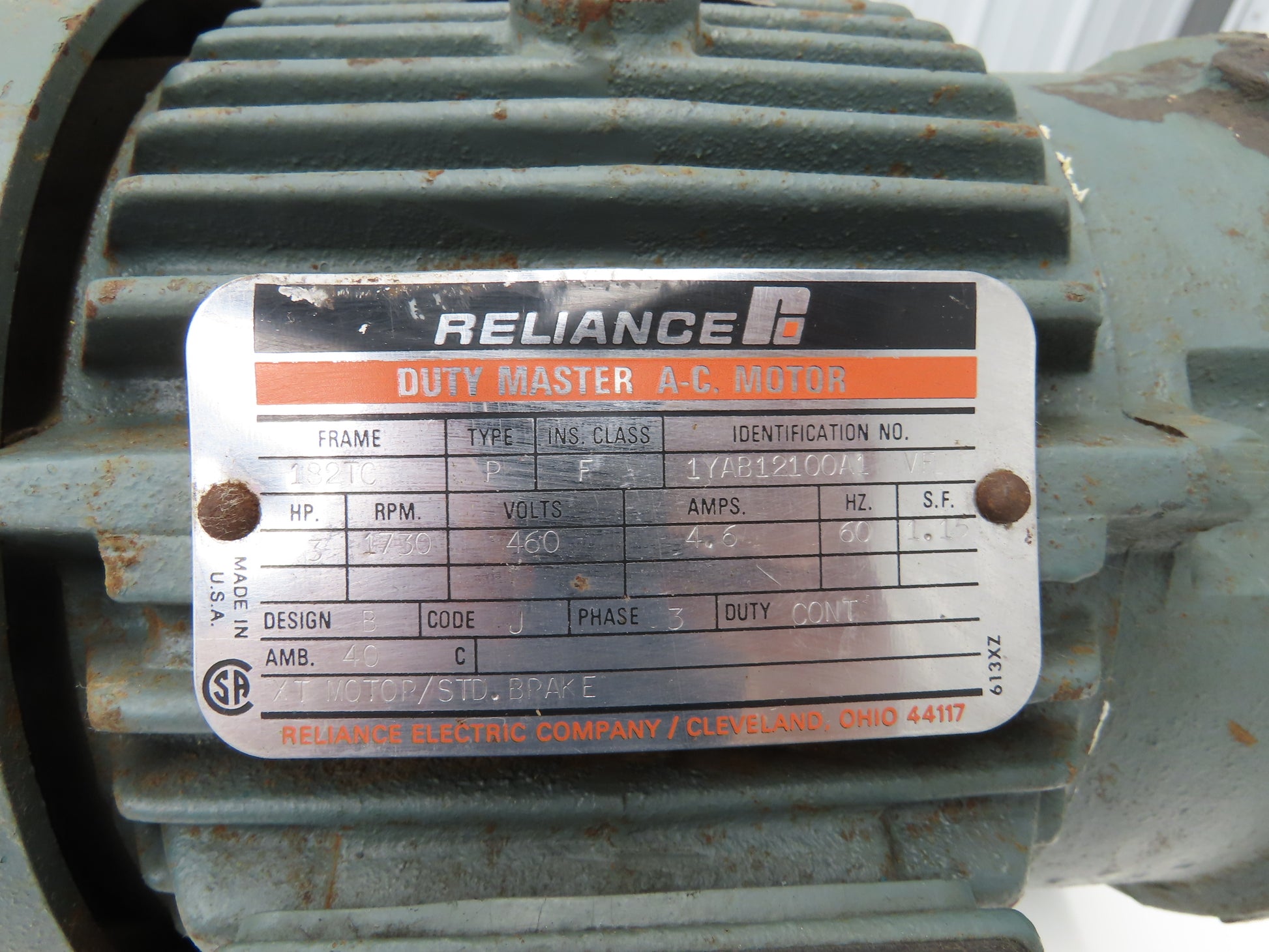Reliance 1YAB12100A1 Duty Master AC Brake Motor 3Hp 1730 RPM 460V 3PH 182TC