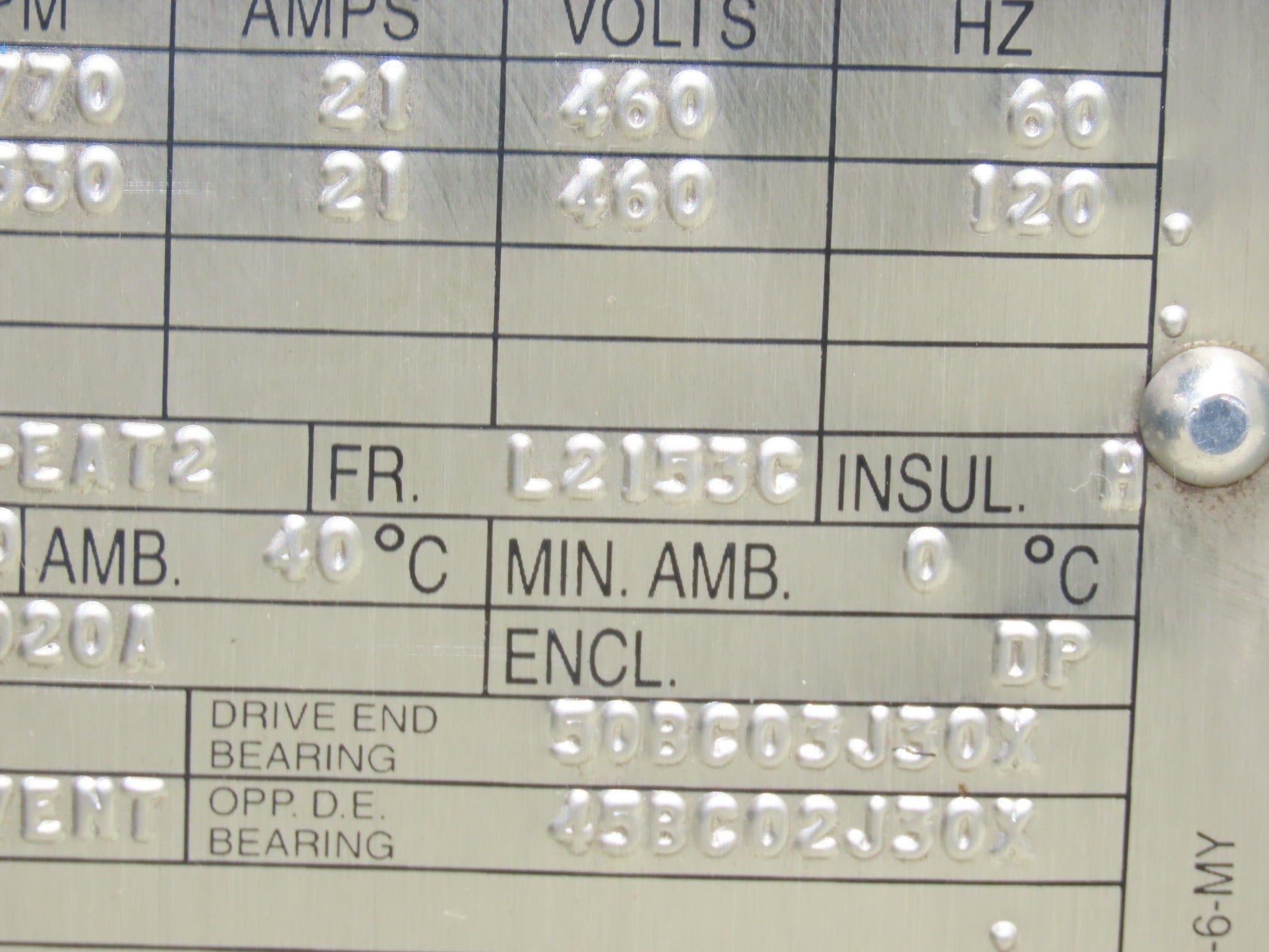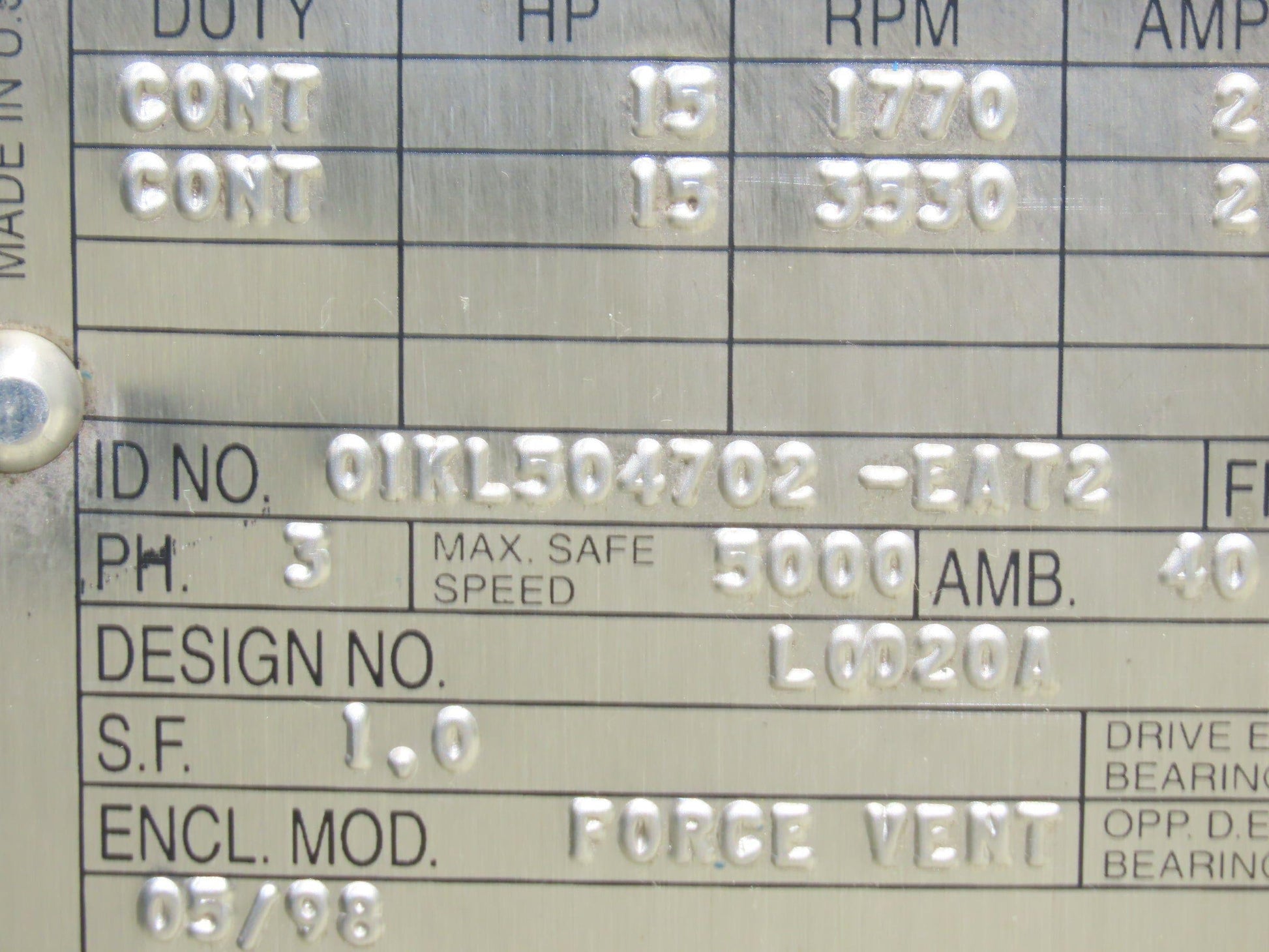 Reliance L2153C RPM AC Motor 15Hp 1770/3500 RPM 460V 3PH 0IKL504702-EAT2