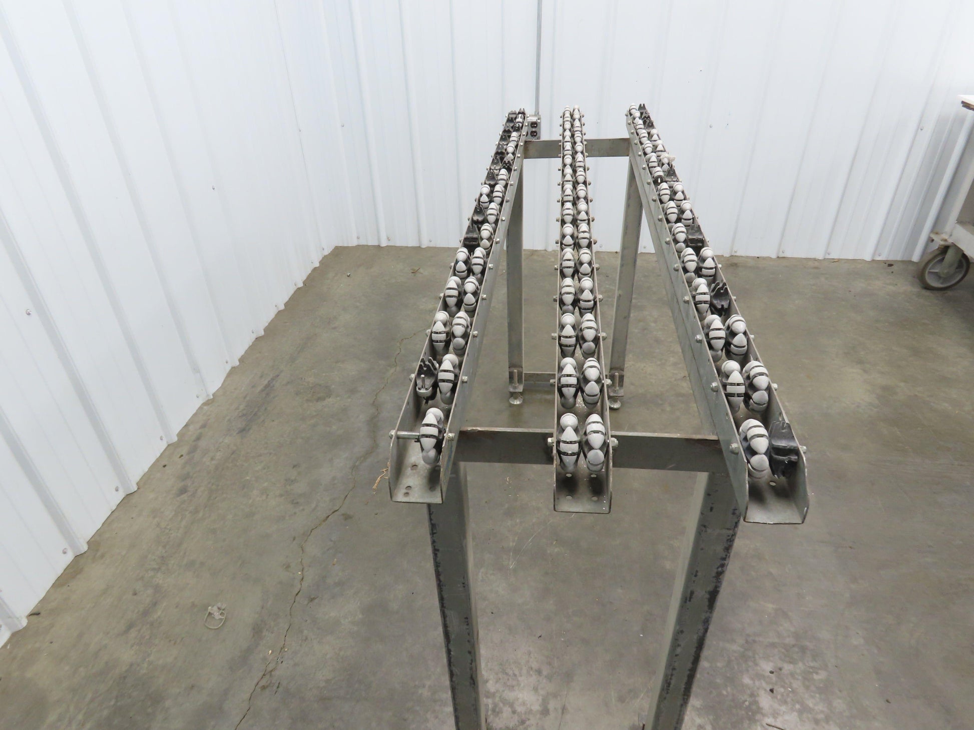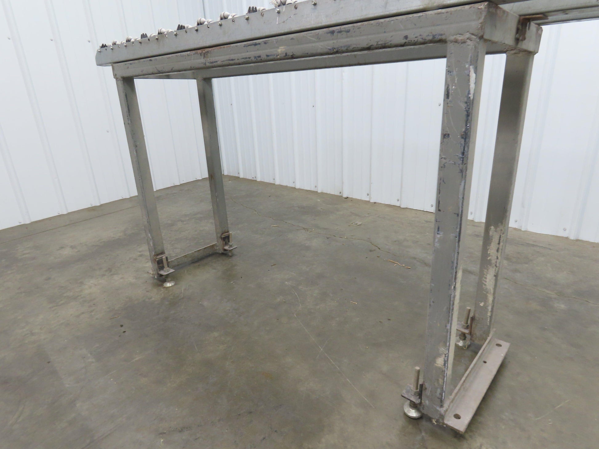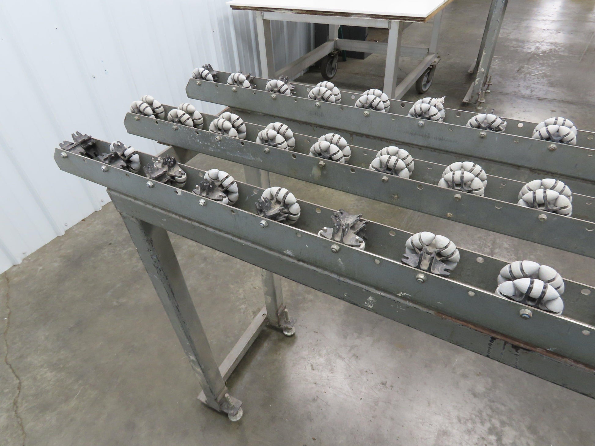 - Roll-Flex Track sections bolted on a 2" steel tube frame with leveling feet.
