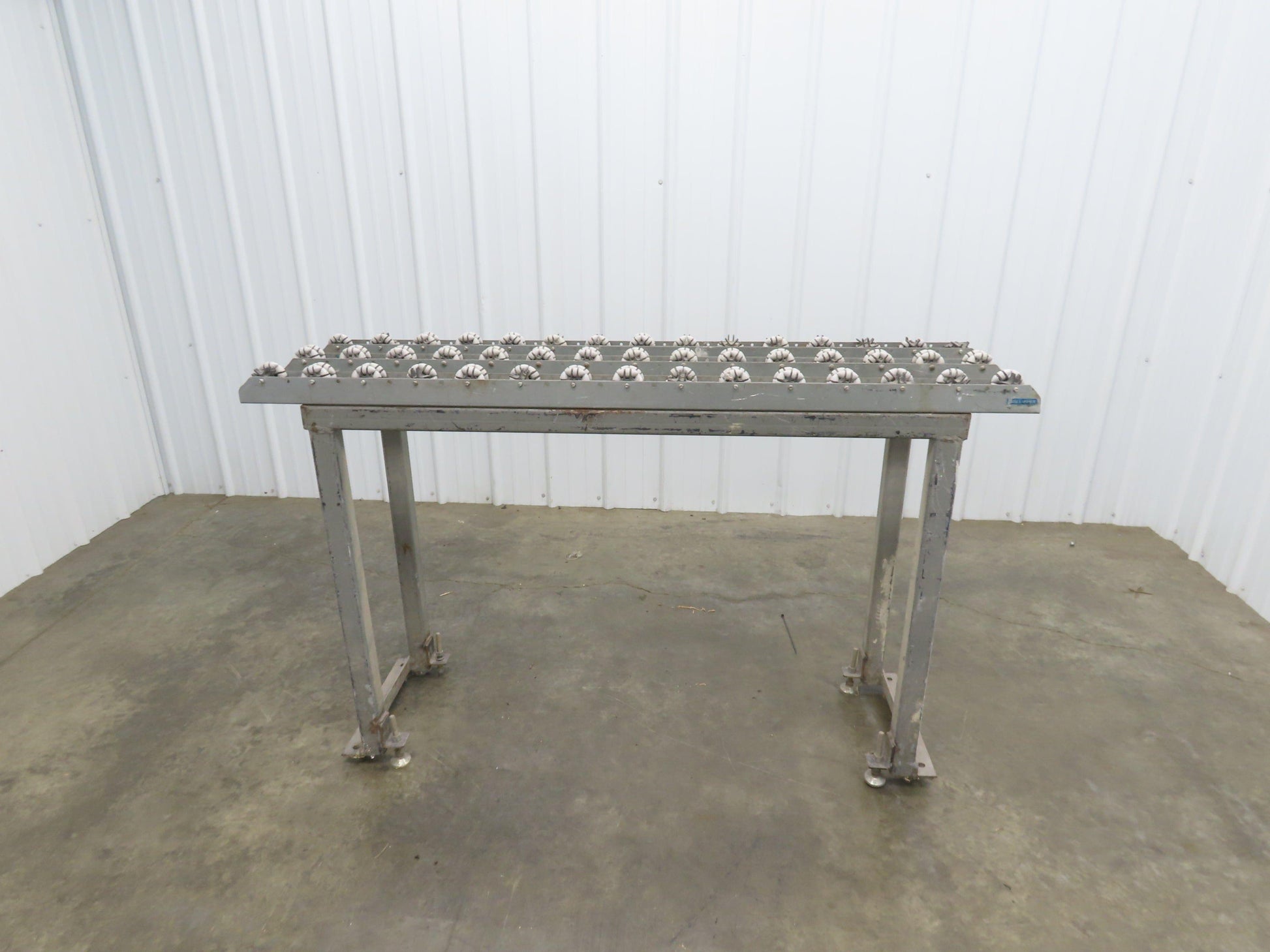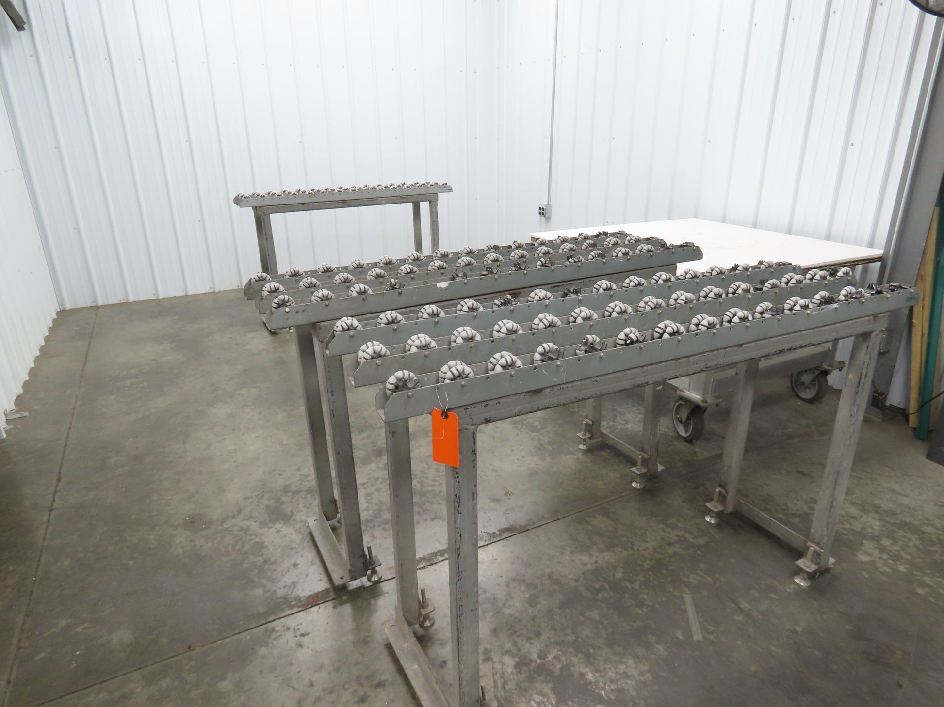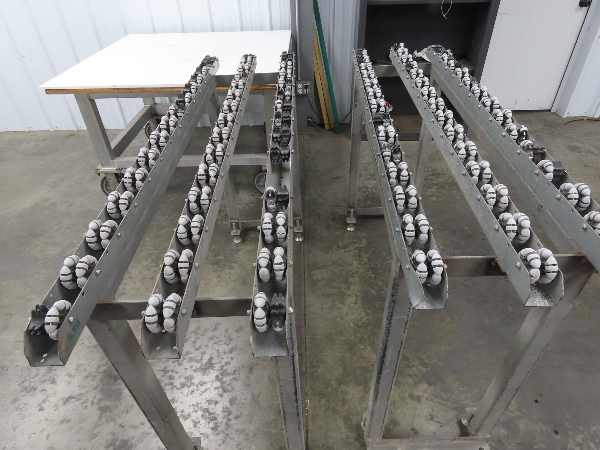 - Roll-Flex Track sections bolted on a 2" steel tube frame with leveling feet.