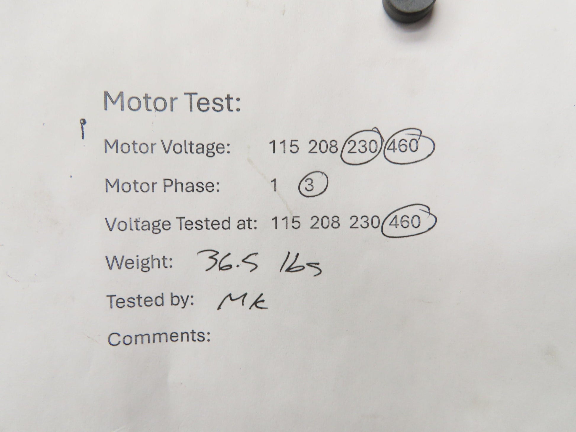 - Voltage tested at and wired for:: 460v