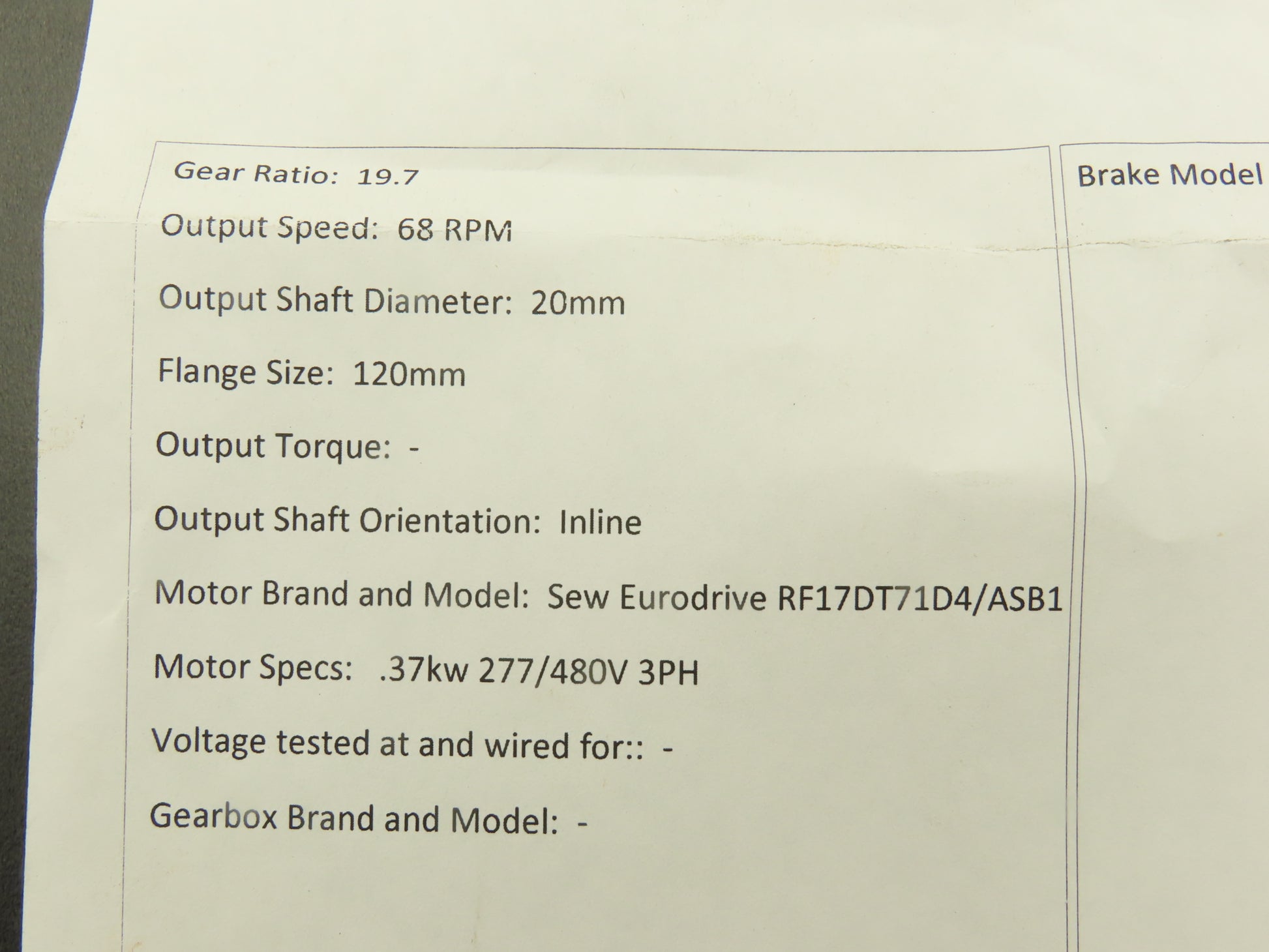 - Motor Brand and Model: Sew Eurodrive RF17DT71D4/ASB1