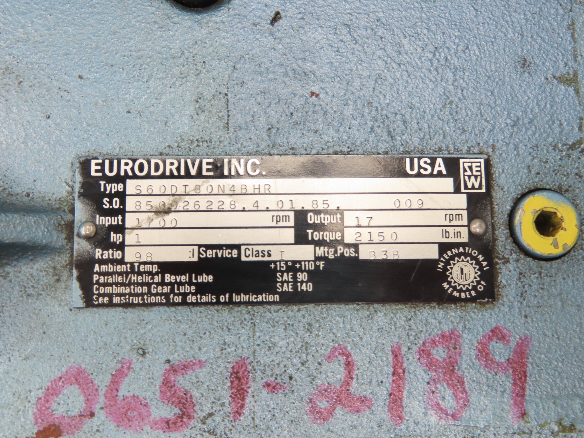 Sew-Eurodrive S60DT80N4BHR Gearbox for Gearmotor 98:1 Reducer 1Hp 17rpm RH