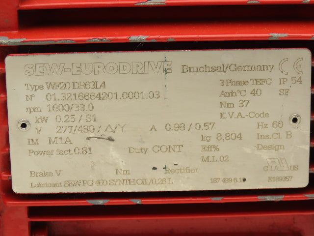 Sew Eurodrive WF20DR63L4 Gearmotor 48:1 Reducer 33rpm .25kw 277/480V 3PH 63L