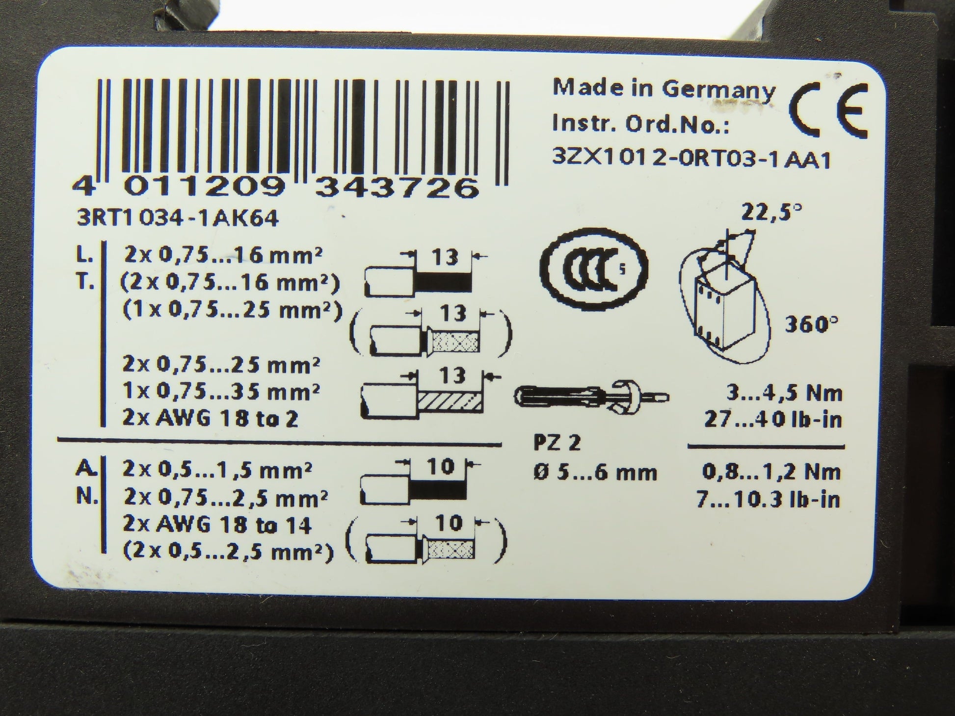 Siemens 3RT1034-1AK64 Motor Starter Contactor 600VAC 45A 18.5kW 3PH 30HP