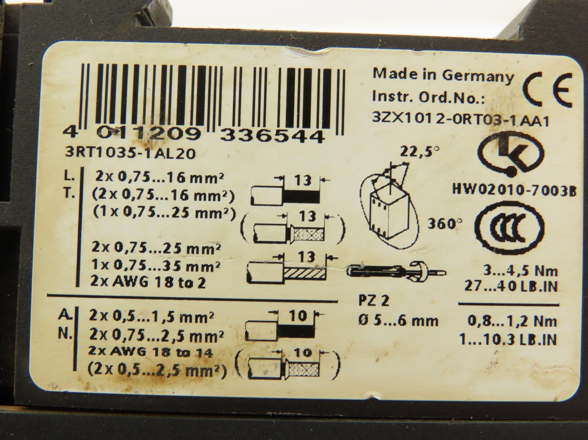 Siemens 3RT1035-1A.0 Contactor 40A 30Hp@460V 3Ph 50/60Hz