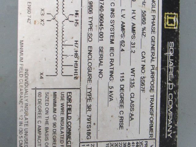 Square D 5S67F 240/440V Pri 110/220 V Sec 5kVa 1Ph Transformer