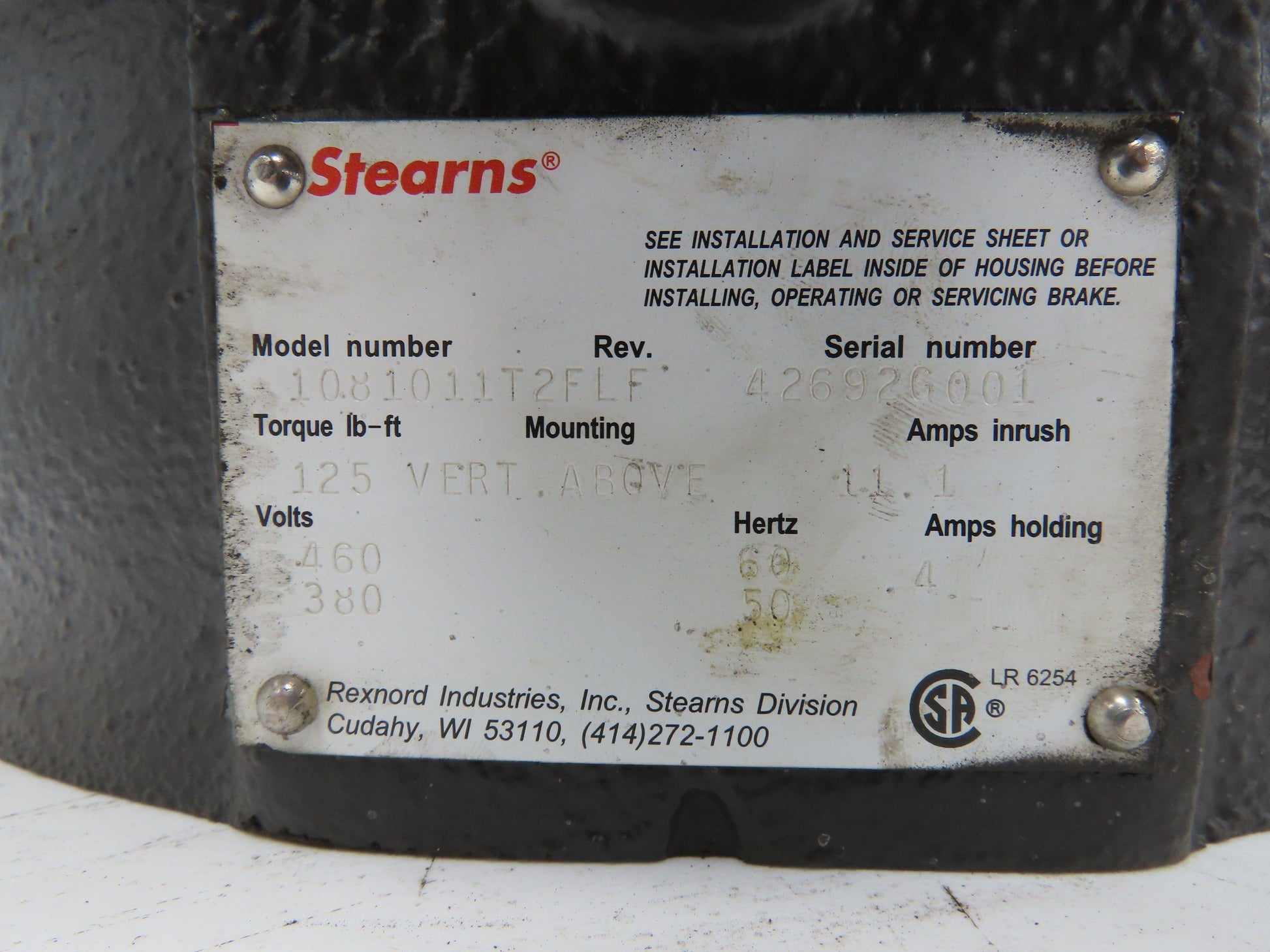 Stearns 1081011T2FLF Clutch Brake 125 Ft-Lb 460V 3PH 324/236TC -Incomplete-