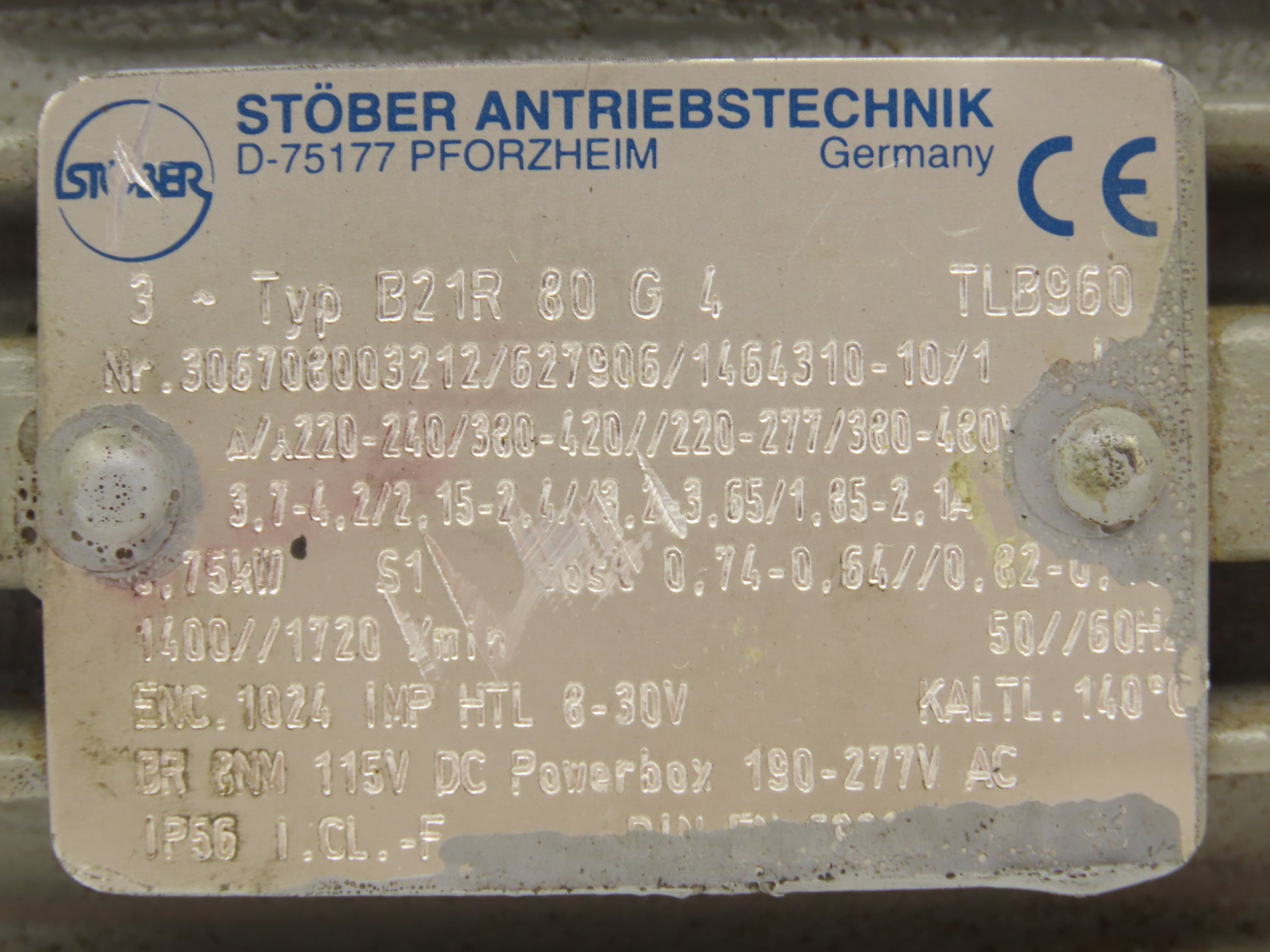 Stober B21R 80 G4 Brake Motor for Gearbox 1Hp 1720 RPM 220-480V 3PH IEC 80 Frame