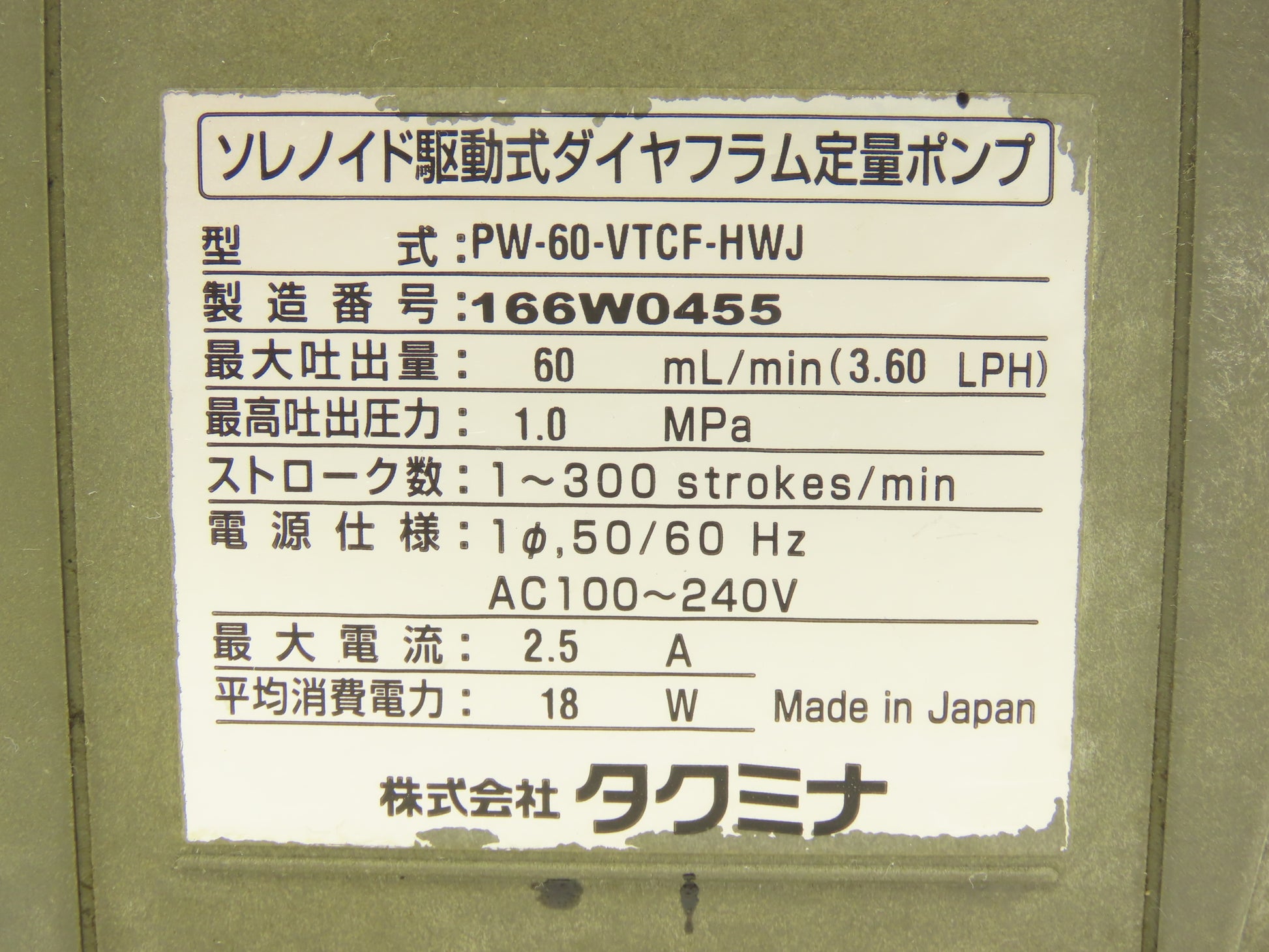 Tacmina PW-60-VTCF-HWJ Diaphragm Solenoid Metering Pump 60mL/Min 100-240V