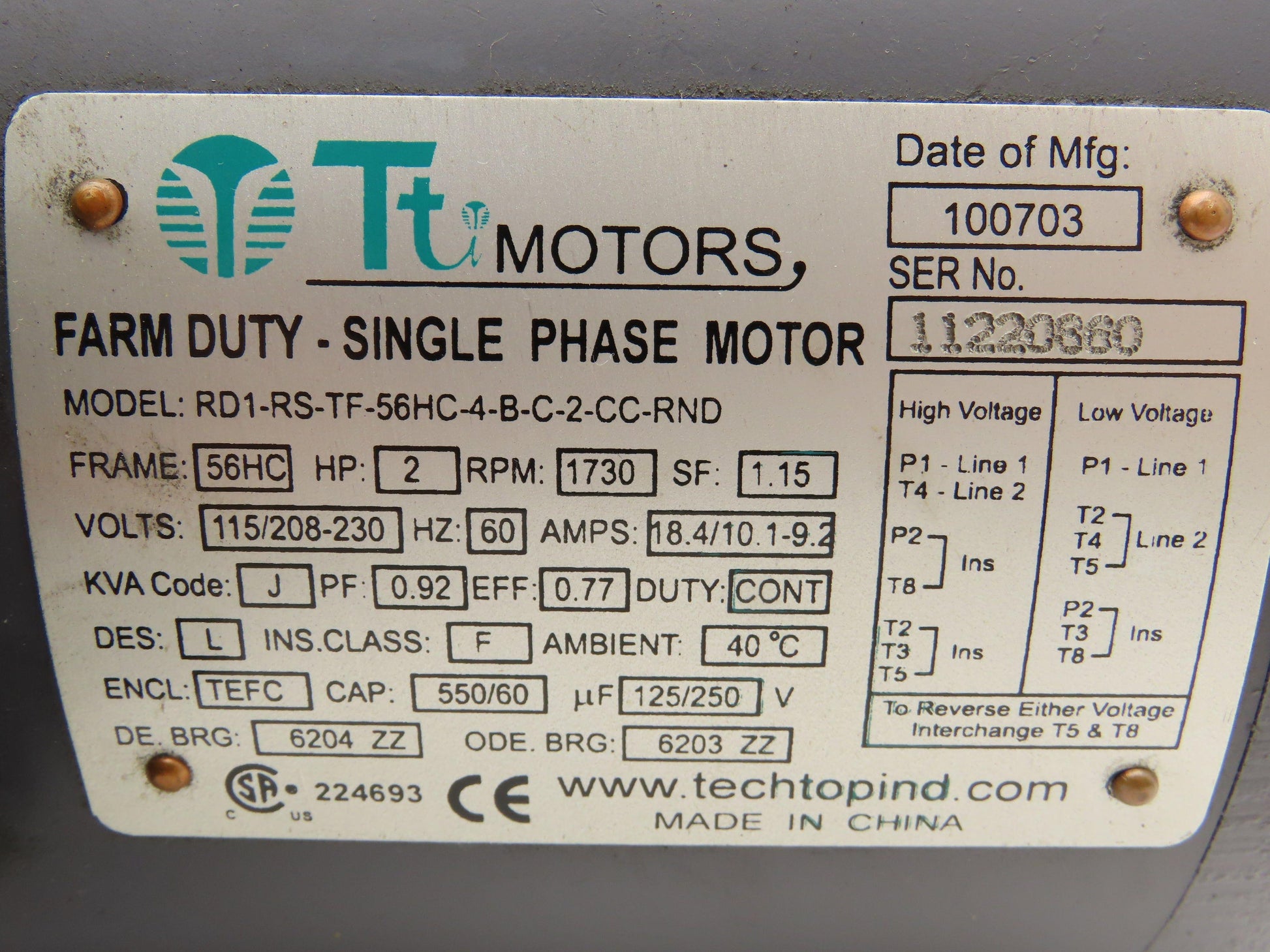 Techtop RD1-RS-TF-56HC-4-B-C-2-CC Farm Duty Motor 2Hp 1730 RPM 115/230V 1PH 56HC