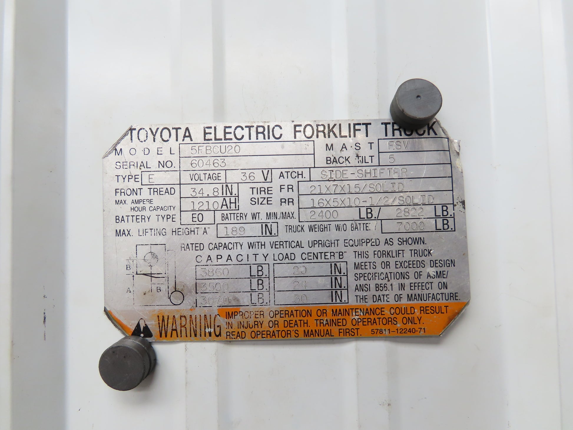 - In good used condition off of a Toyota 5FBCU20 electric forklift