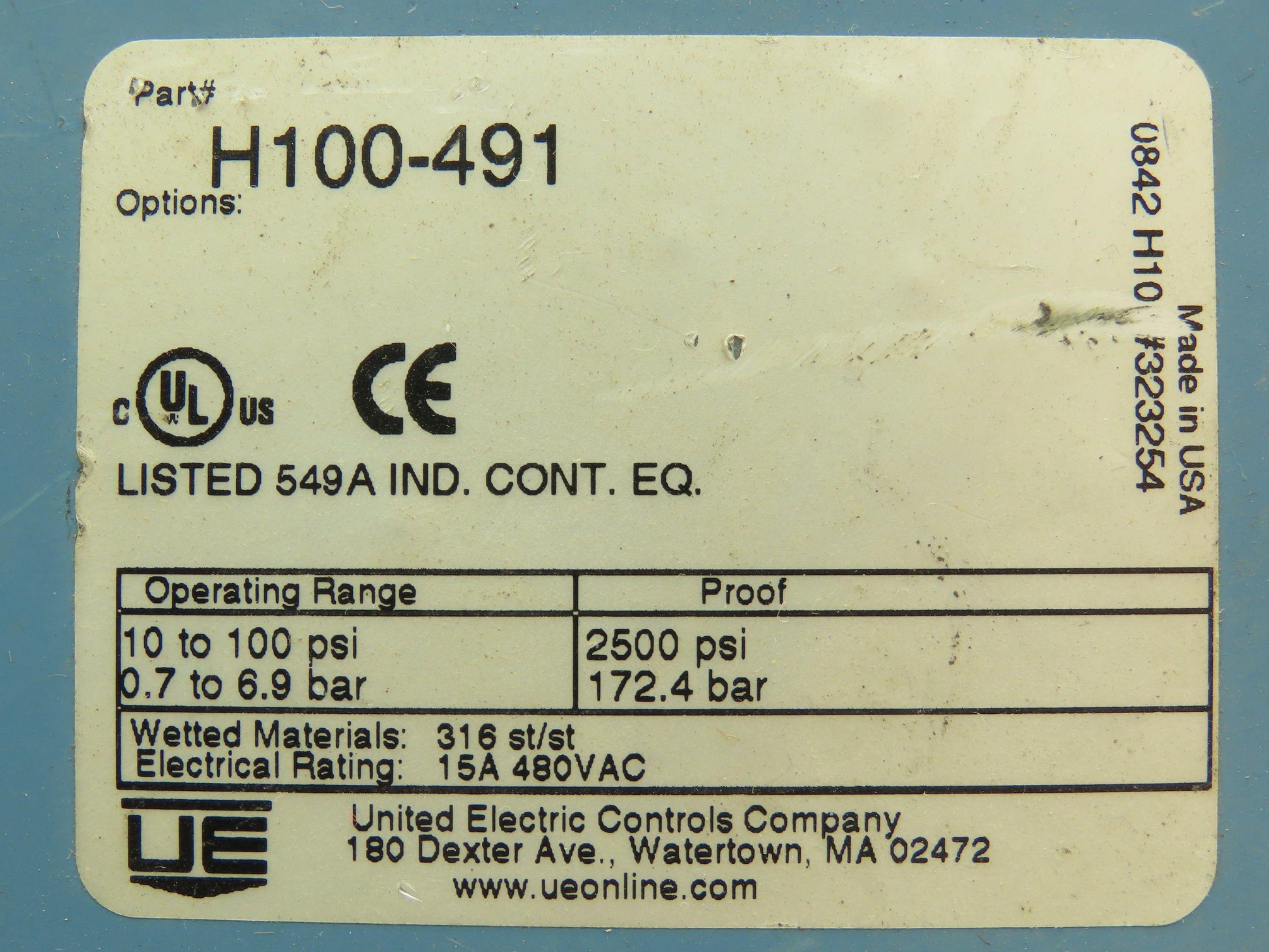 United Electric H100-491 Pressure Switch 10-100 PSI 15A 480V
