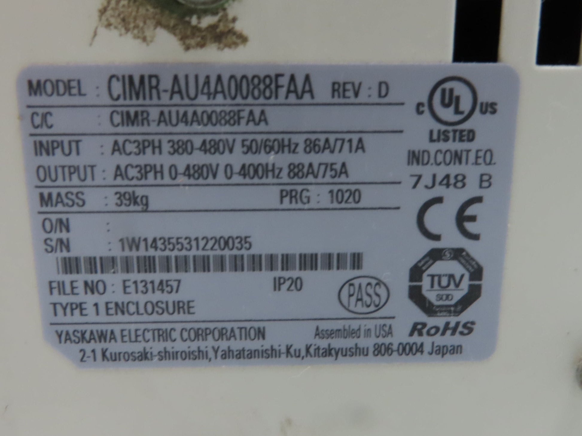 Yaskawa CIMR-AU4A0088FAA AC Drive 60HP 380-480V 3PH In 0-480VAC 0-400Hz 88A Out