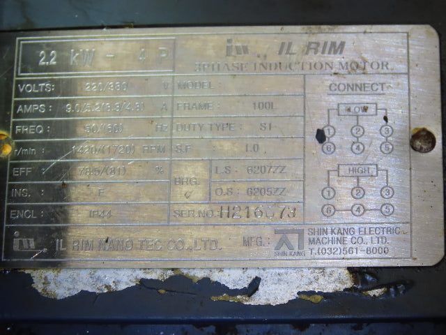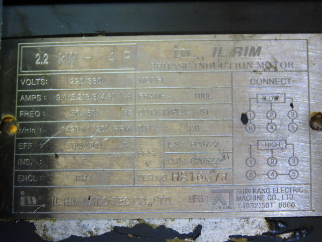 - Motor Specs: 2.2kw 1720 RPM 220/380V 3PH 100L Frame